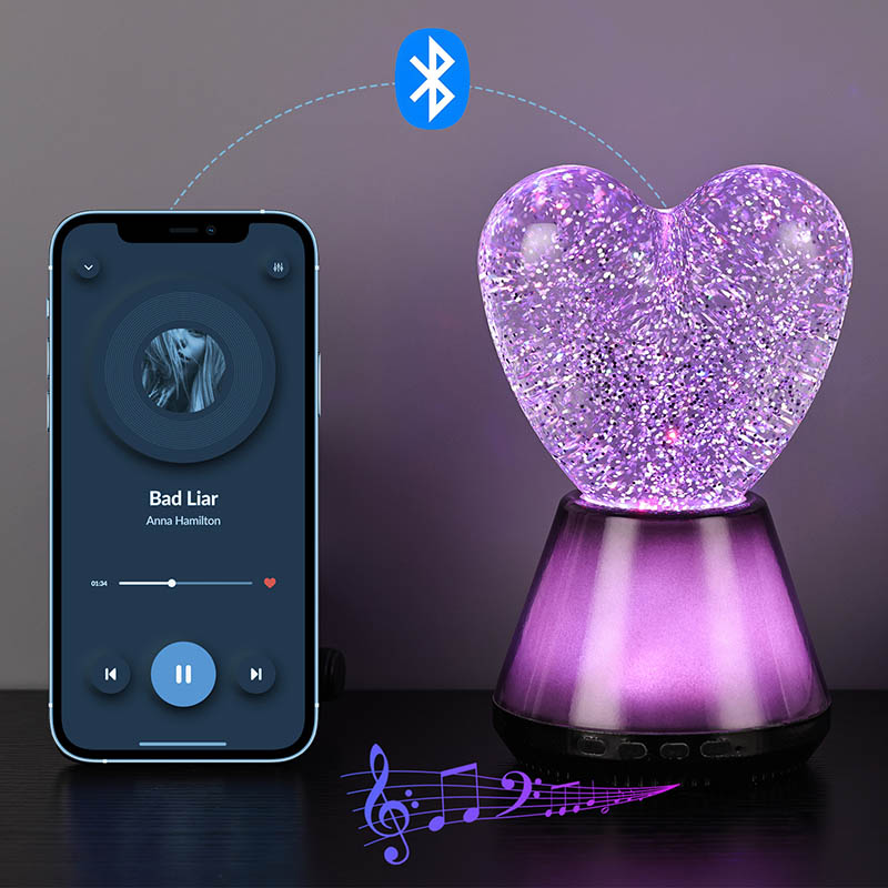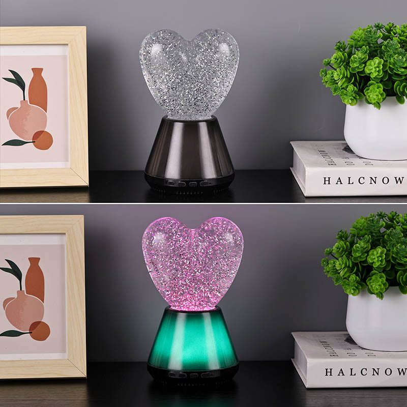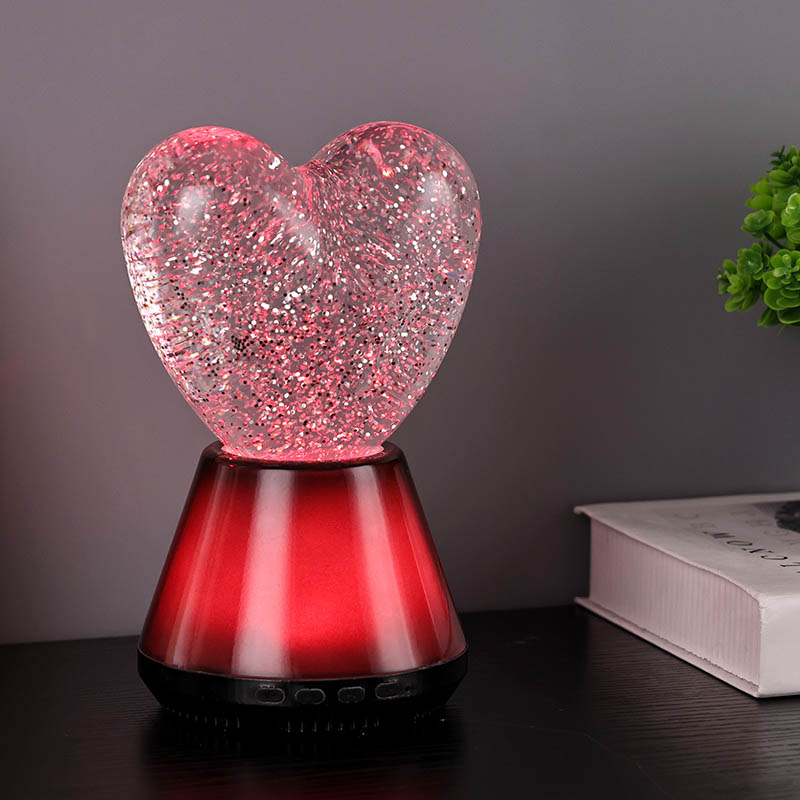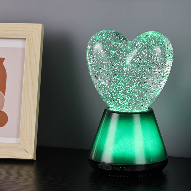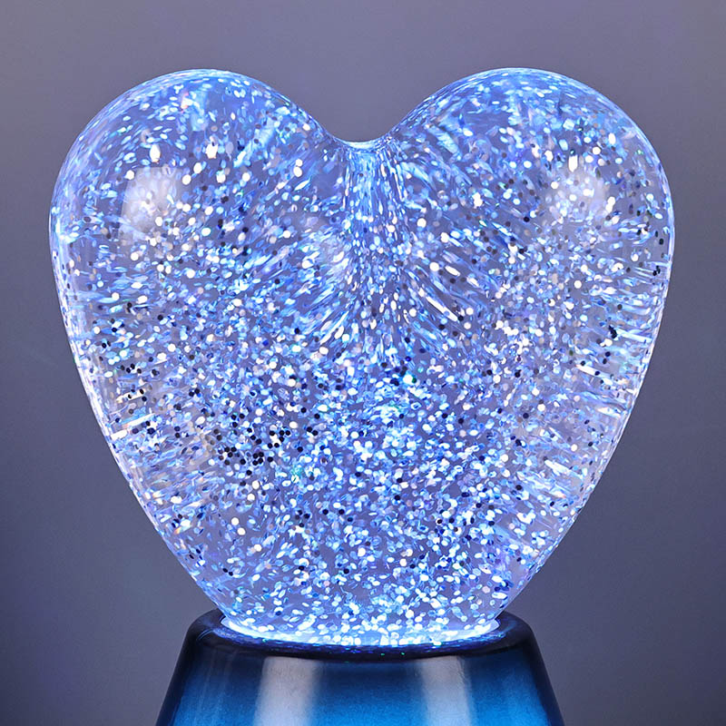 Ang interior ng Bluetooth control na led glitter heart night light ay puno ng misteryosong likido, kung saan lumulutang ang hindi mabilang na kumikinang na mga sequin. Kapag nakabukas ang lampara, dahan-dahang dadaloy ang likido sa loob ng hugis pusong bolang salamin, na lumilikha ng parang panaginip na epekto. Ang mga sequin na ito ay tila nakakalat na mga bituin, malumanay na lumulutang sa likido, na nagbibigay sa mga tao ng pakiramdam na nasa mabituing kalangitan. Maging ito ay araw o gabi, na may lilim ng puso maaari itong magdulot ng sorpresa at kagalakan sa mga bata, na nagpapahintulot sa kanila na ilabas ang kanilang imahinasyon sa panaginip na liwanag.