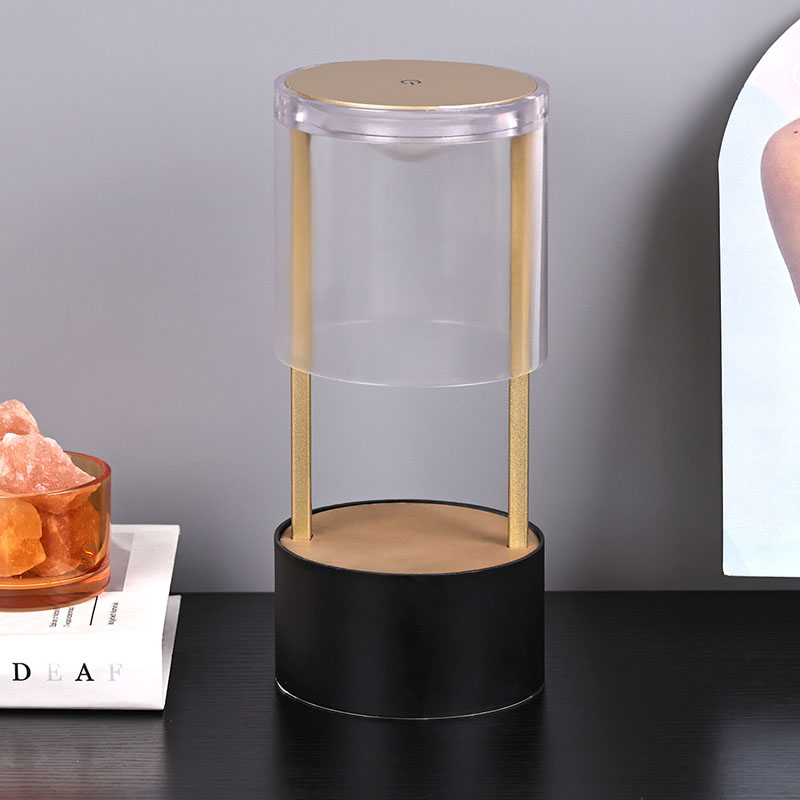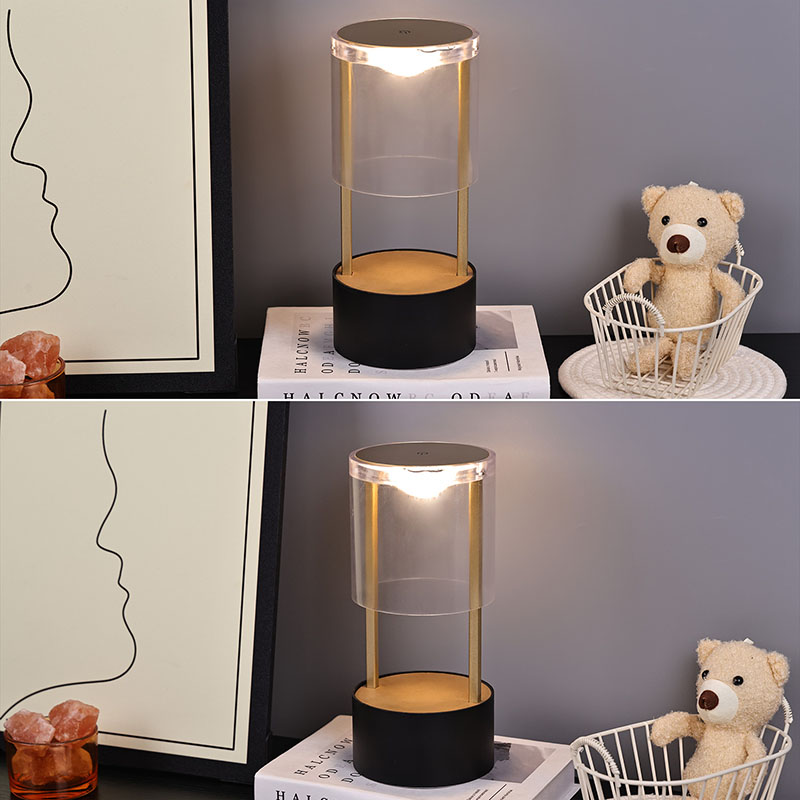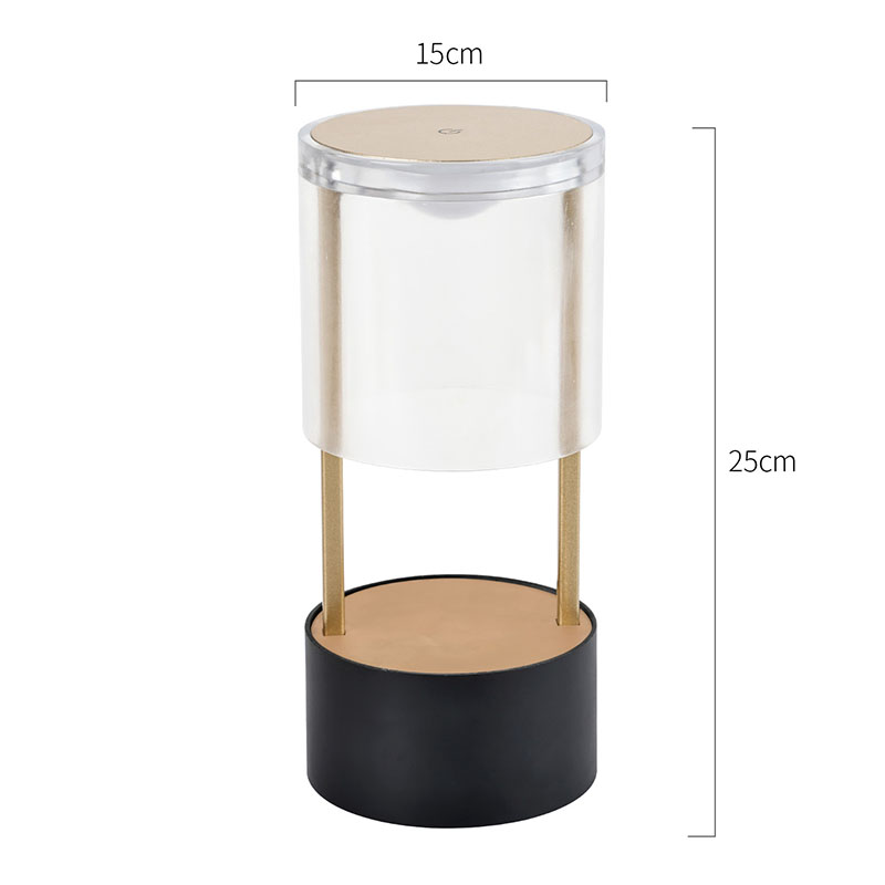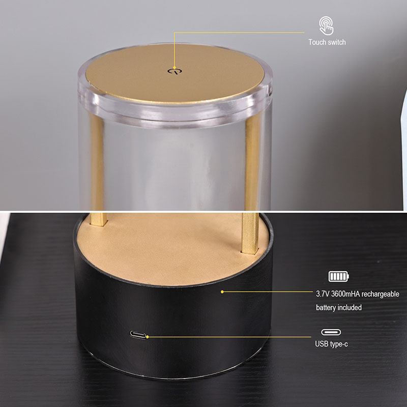 Ang tuktok ng Lantern Style Small Table Lamp ay isang touch sensitive na light switch, na may type-c rechargeable charging head sa ibaba. Ang tuktok ay binubuo ng isang transparent na takip ng acrylic, at ang ibaba ay isang metal na base. Ang pangkalahatang pabilog na istraktura ay nagbibigay-daan para sa movable lighting