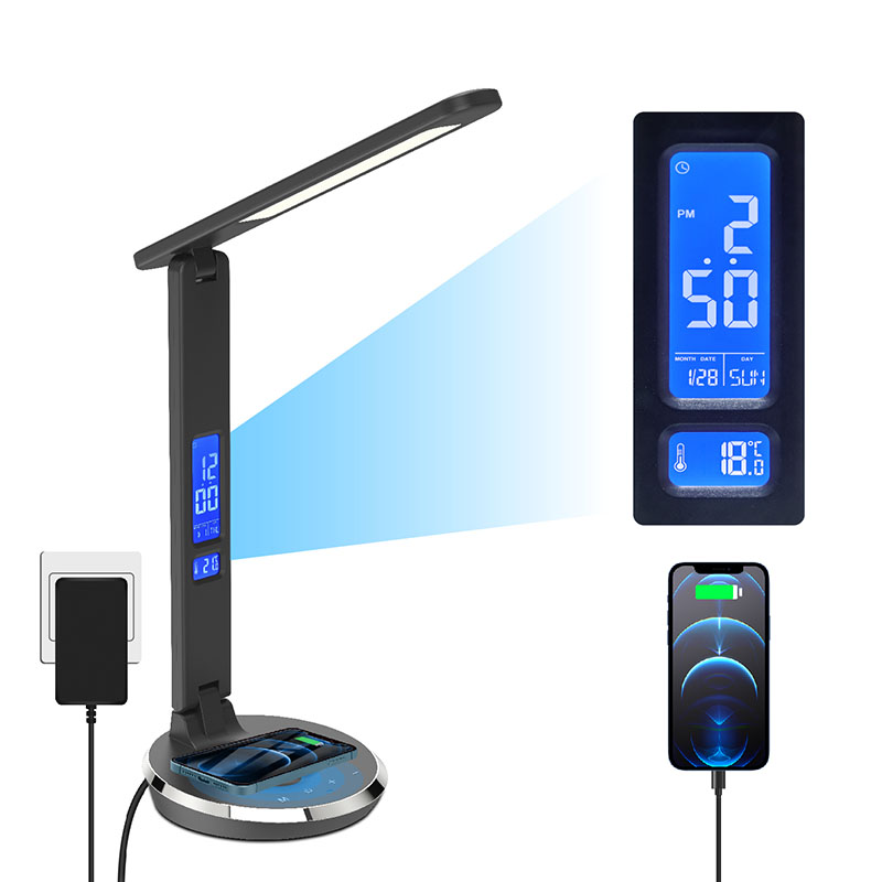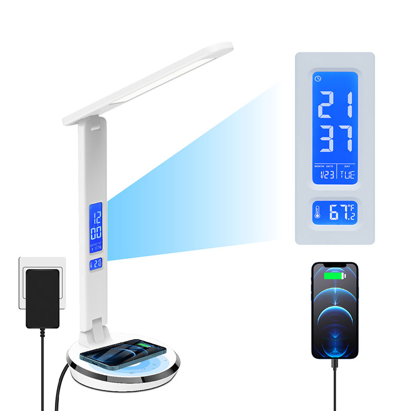 May LCD screen na may Temperature display、Oras、Alarm clock、Perpetual na kalendaryo na may back body contorl button. At may usb charge port sa likod ng shade ng desk lamp.