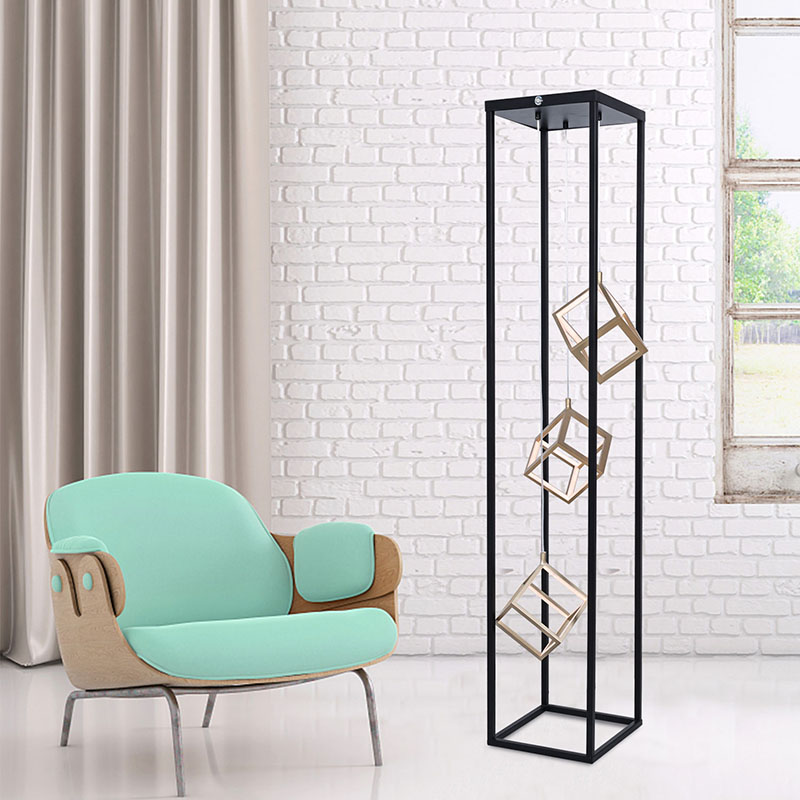 Mga modernong idinisenyong floor lamp, ang pinakamalaking tampok ng produkto ay ang hugis-parihaba na hugis ng frame na binubuo ng metal, na may 3 parisukat na LED chandelier sa loob. Ang pangkalahatang disenyo ay maaaring gamitin bilang dekorasyon sa bulwagan, at mayroong isang pindutan sa itaas upang makontrol ang intensity ng liwanag
