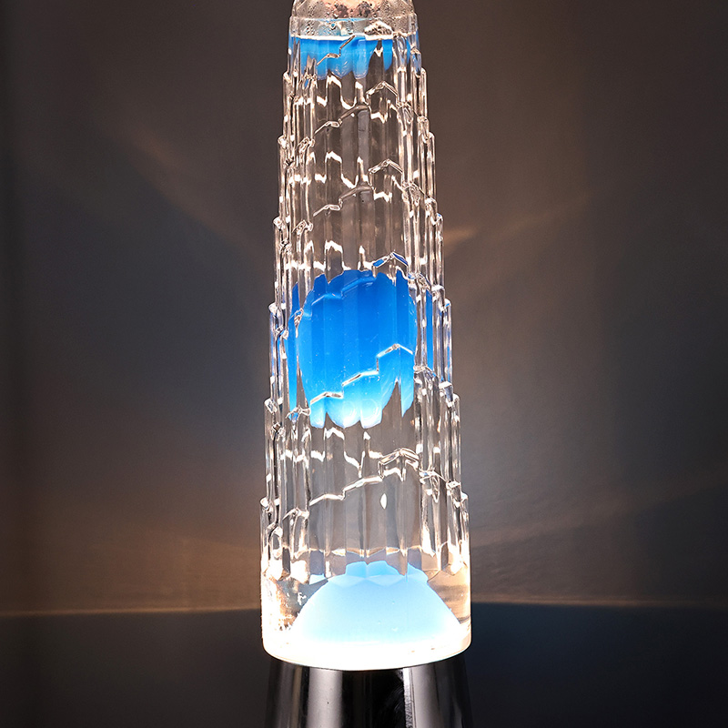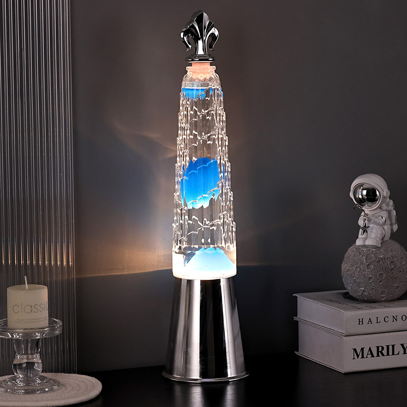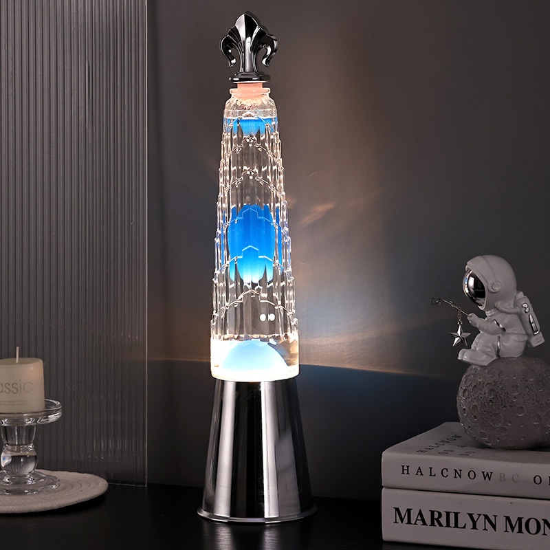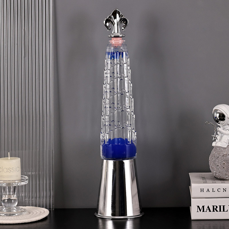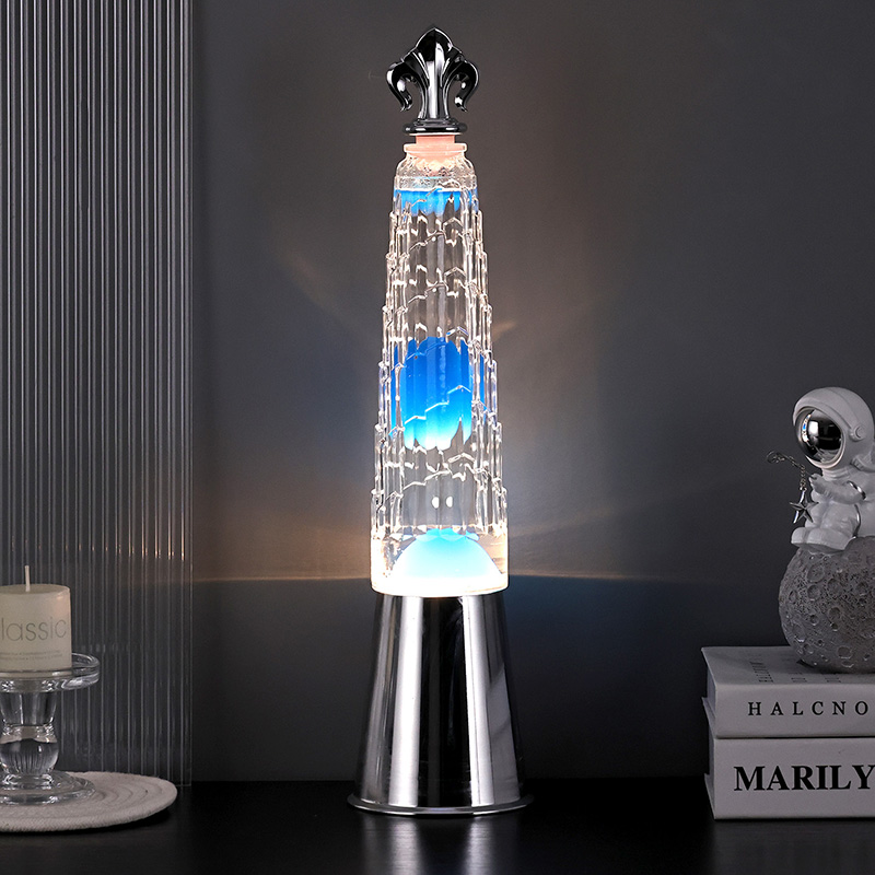 Nagtatampok ang Tower shade lava lamp table lamp ng isang klasikong disenyong hugis tore, na may katangi-tanging itim na mga dekorasyong metal na naka-embed sa itaas, simple ngunit marangal. Sa loob ng transparent na bote ng salamin, naroroon ang asul na waks
