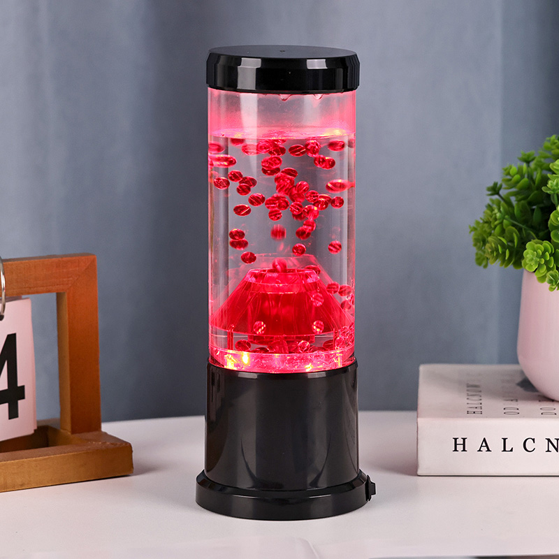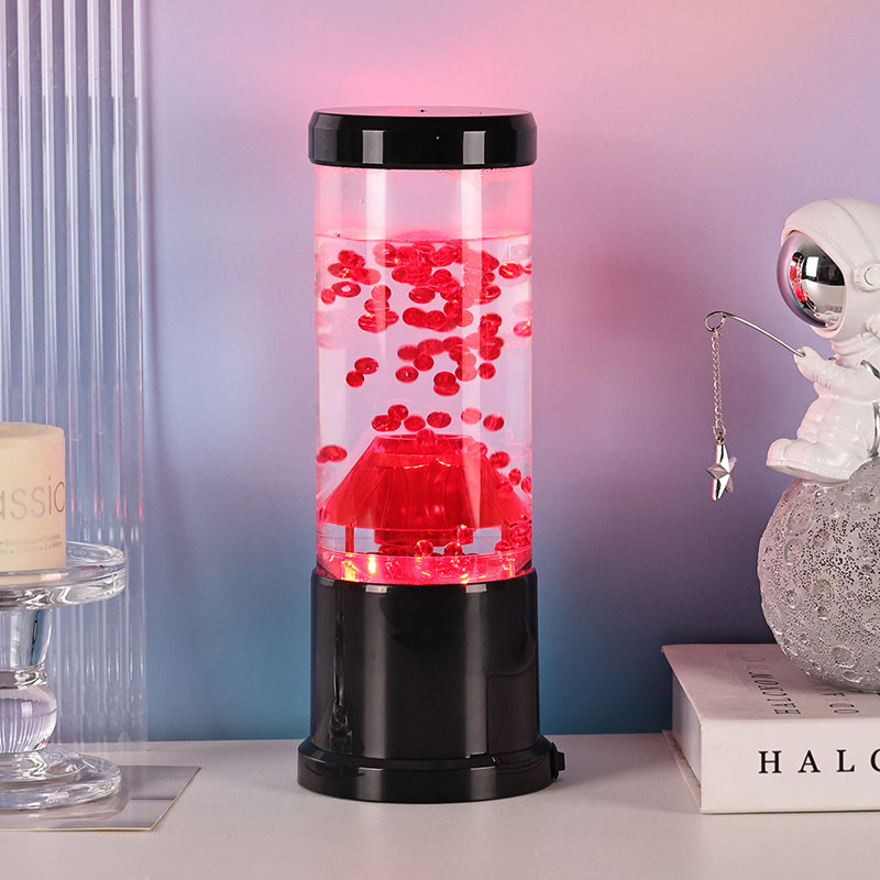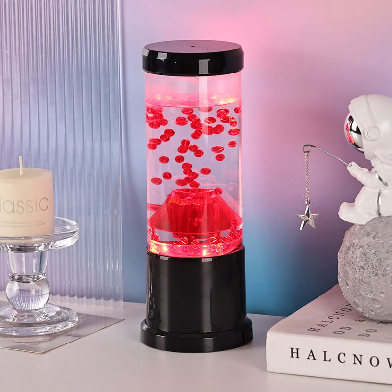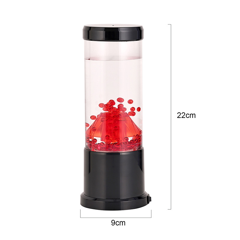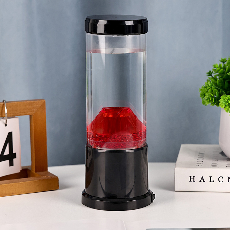 Ang gitnang bahagi ng ilaw sa gabi ay isang transparent na haligi na kahawig ng bunganga ng bulkan. Sa loob ng column na ito, makakakita ka ng makulay na pagpapakita ng mga pulang globo, na parang nilusaw na lava na dumadaloy sa loob ng crust ng lupa. Ang mga sphere na ito ay lumulutang nang maganda sa loob ng isang malinaw na likido, na lumilikha ng isang pabago-bago at pabago-bagong visual effect. Habang sumisikat ang liwanag, naglalabas ito ng mainit at nakakaakit na liwanag, perpekto para sa paglalagay ng maaliwalas na kapaligiran sa anumang silid.