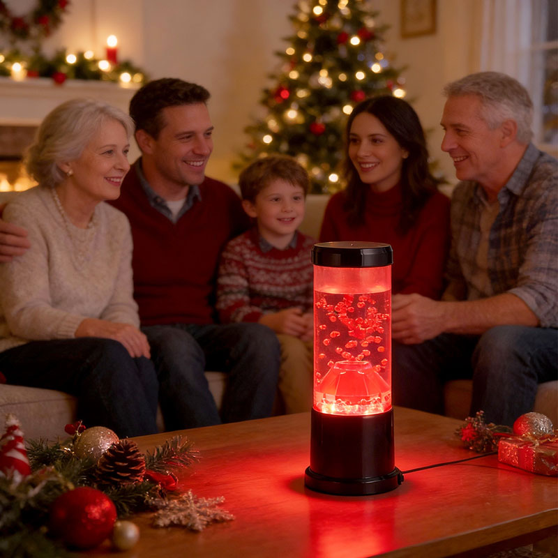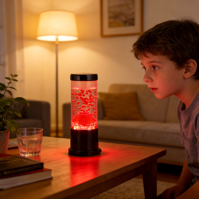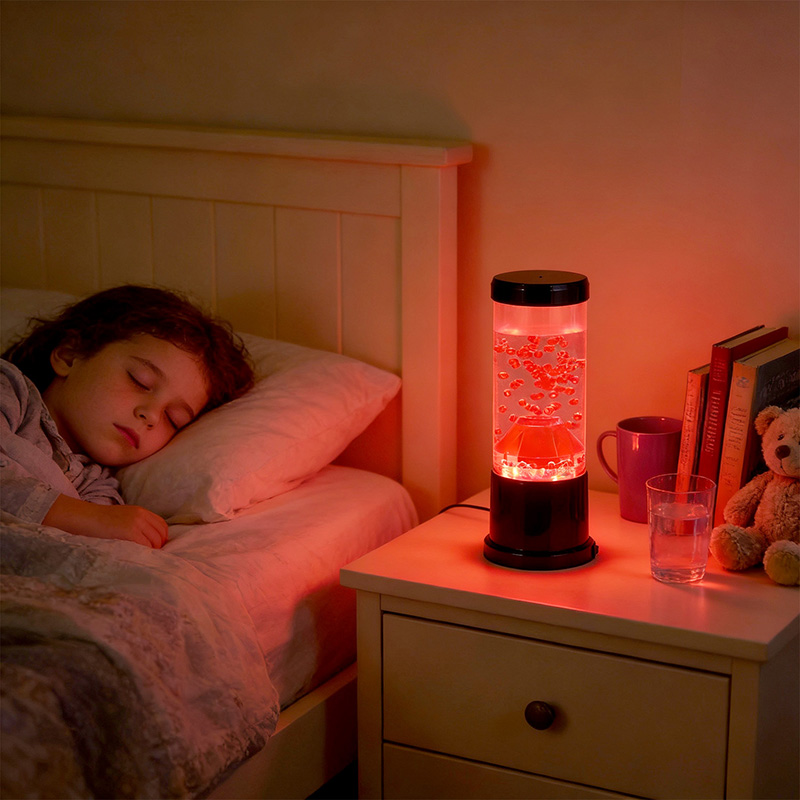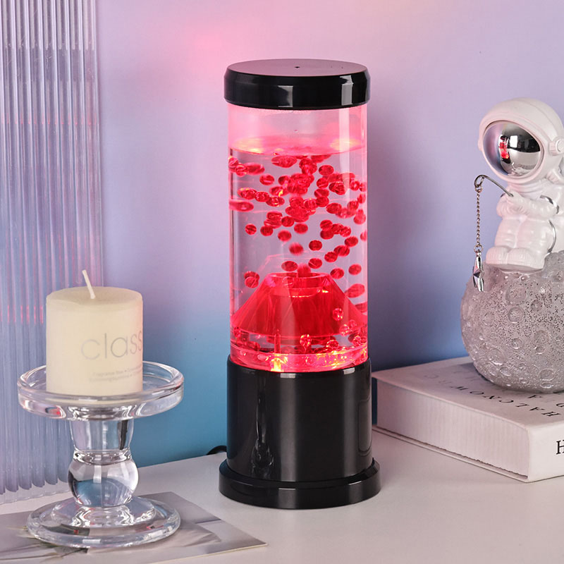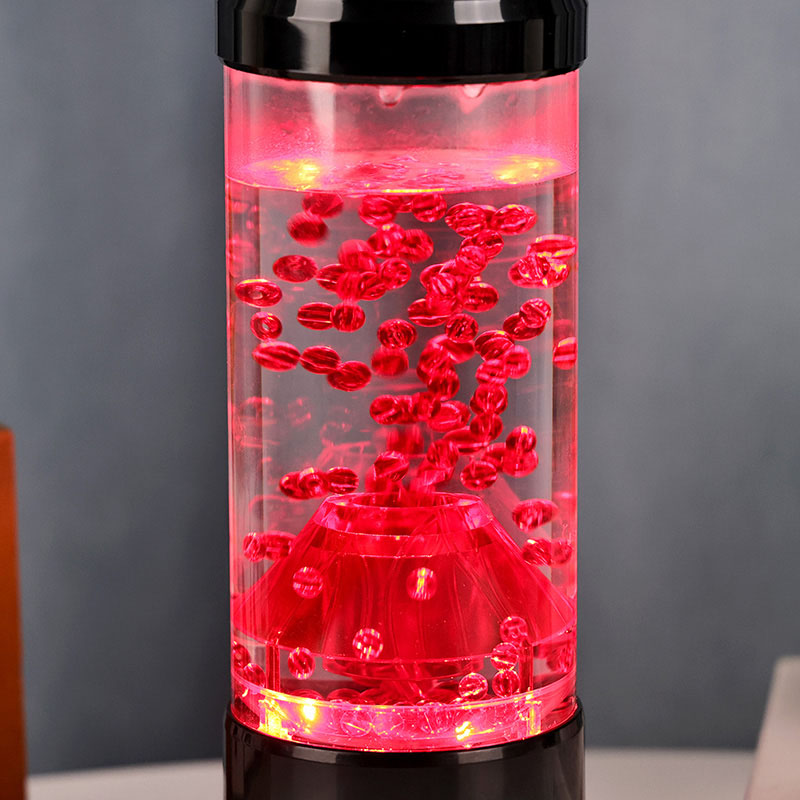 Ang gitnang bahagi ng ilaw sa gabi ay isang transparent na haligi na kahawig ng bunganga ng bulkan. Sa loob ng column na ito, makakakita ka ng makulay na pagpapakita ng mga pulang globo, na parang nilusaw na lava na dumadaloy sa loob ng crust ng lupa. Ang mga sphere na ito ay lumulutang nang maganda sa loob ng isang malinaw na likido, na lumilikha ng isang pabago-bago at pabago-bagong visual effect. Habang sumisikat ang liwanag, naglalabas ito ng mainit at nakakaakit na liwanag, perpekto para sa paglalagay ng maaliwalas na kapaligiran sa anumang silid.